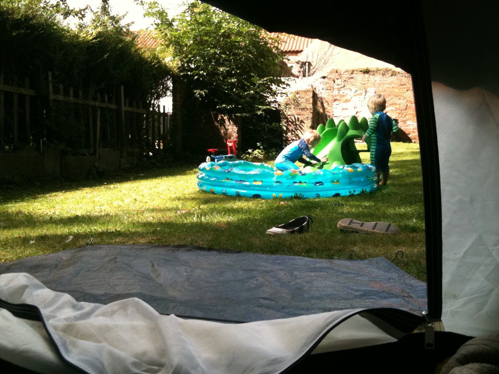 Monday the sun shone (surely it shouldn't be such the novelty that it was, seeing that it is August after all)! We had a lovely day in the garden. The tent got put up and we lounged around inside, eating nectarines and I tried to finish off my book (The Memory-Collector's Daughter - quite a good read). I also put up the paddling pool and Joseph discovered 110 different ways to slide down the slide into the pool.